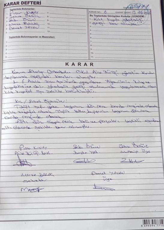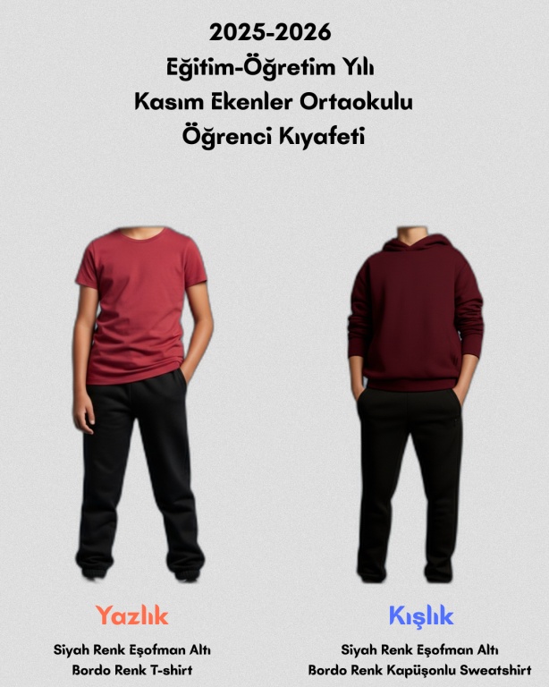 5 Aralık 2024 tarihinde yayınlanan Milli Eğitim Bakanlığına Bağlı Okul Öğrencilerinin Kılık ve Kıyafetlerine Dair Yönetmelikte Değişiklik Yapılması Hakkında Yönetmelik ve Temel Eğitim Genel Müdürlüğünün Okullarda Öğrencilerin Kıyafet/Formalarının Belirlenmesine Dair Usul ve Esaslar doğrultusunda; ilkokul, ortaokul ve liselerde öğrenciler için okul kıyafetinin, okul-aile birliği yönetim kurulunun ve ikinci dönem başında yapılacak öğretmenler kurulunda öğretmenlerin de görüşü alınarak özel işaret, baskı ve desen gibi kısıtlayıcı ayrıntılara yer verilmeden okul müdürlüğünce belirleneceği ifade edilmiştir. Bu doğrultuda yeni dönemde kıyafet alacak velilerimiz, aşağıdaki görsellerde belirtilen renklerdeki kıyafetleri istedikleri yerden yönergeye uygun olarak alabilir. Geçmiş dönem kıyafeti olanlar ise var olan kıyafetlerini kullanabileceklerdir.